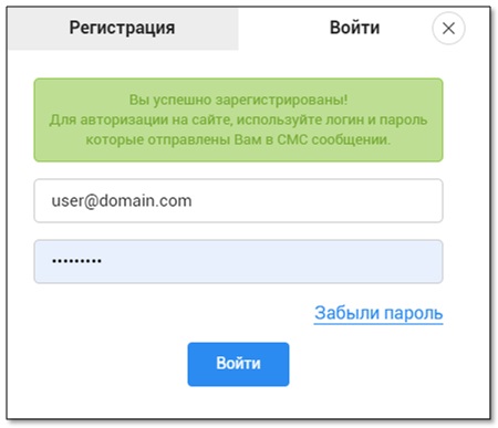 После того, как вы нажмёте кнопку "Зарегистрироваться", на ваш Email и на телефонный номер придёт письмо содержащее логин и пароль для входа в аккаунт.