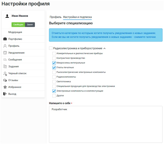 Информацию о специализации вашей компании и другие сведения можно изменить на вкладке «Настройка и подписка»: