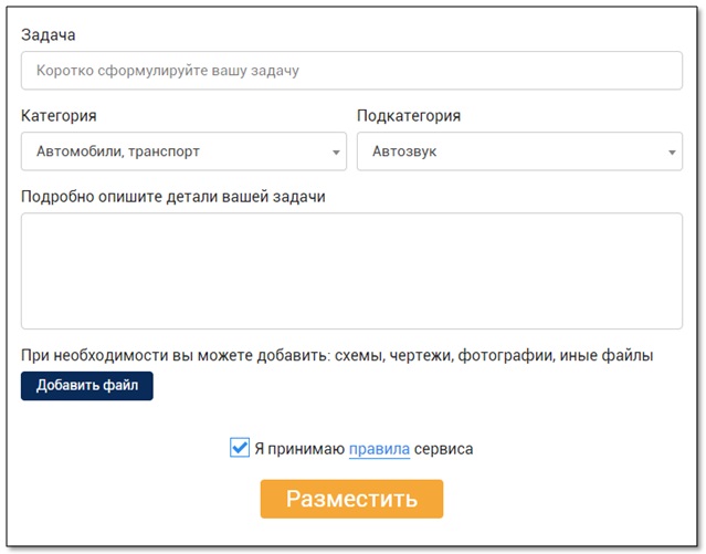 Заполните все поля. При необходимости можно загрузить схемы и рисунки. После нажатия кнопки «Разместить» задание попадает на модерацию (обычно несколько часов).